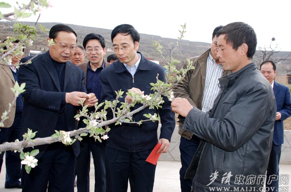 4月16日下午,全國農(nóng)技中心副主任鐘天潤一行,在甘肅省農(nóng)技站站長李福、天水市農(nóng)業(yè)局局長劉來生及麥積區(qū)委書記蒲軍、副區(qū)長楊鐵森等的陪同下,深入麥積區(qū)南山萬畝花牛蘋果基地,實地察看了蘋果、花椒、油菜等果樹和農(nóng)作物受雪凍災(zāi)害影響情況,并詳細了解該區(qū)整體受災(zāi)損失和開展防凍減災(zāi)應(yīng)急工作情況。