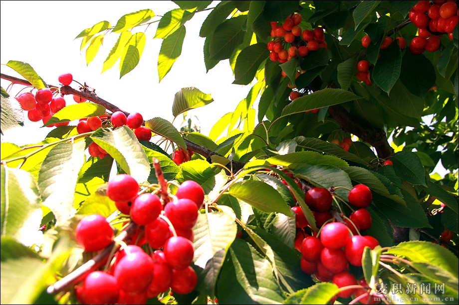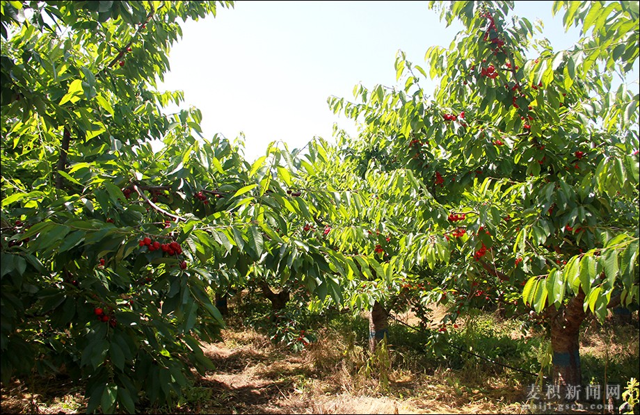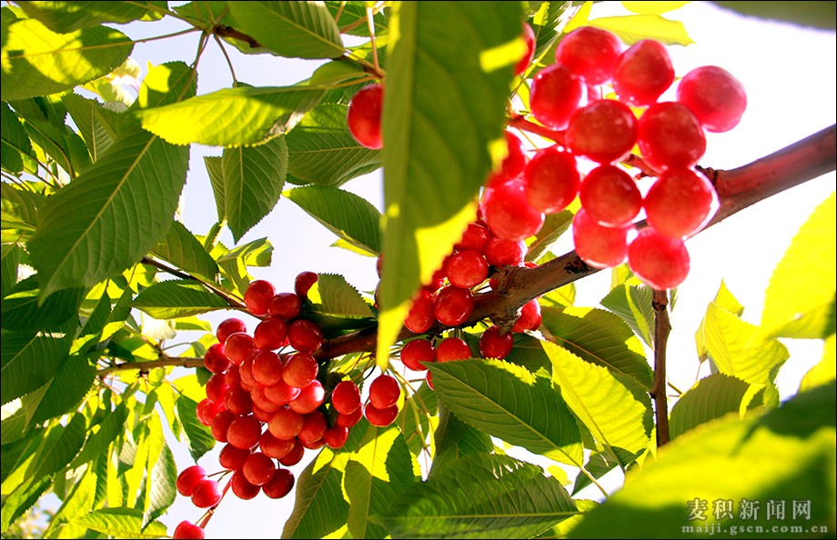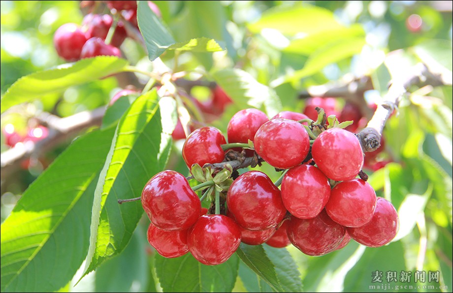 雨后的早晨,樹木輕輕抖落水珠舒展枝葉,路邊的花叢里老綠和新綠層層疊疊,綠肥紅瘦。攜著樹梢清風(fēng),記者來到位于麥積區(qū)甘泉鎮(zhèn)的華實公司大櫻桃示范基地,走在滿是櫻桃的樹下,穿過郁郁蔥蔥的樹枝,漫山遍野的大櫻桃掛滿枝頭,在綠葉的映襯下,一顆顆鮮紅欲滴,晶瑩剔透,濃郁宛如波爾多酒的紅色,清香沁人心脾……