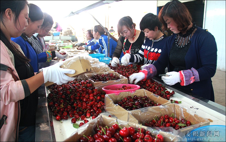 在包裝車間,記者看到工人正在分工有序的忙碌著,分級的、裝箱的、過秤的……滿場的櫻桃一下就吸引了大家的眼球,一顆顆玲瓏小果,晶瑩剔透,紅中泛紫。薄薄的皮兒,裹著水靈的果肉,入口輕輕一抿,酸酸甜甜的汁液,便會牽動每一個味蕾,美味無以言表!熬G蔥蔥,幾顆櫻桃葉底紅。”果兒或紅或紫,就那么玲瓏有加,就那么剔透備至。櫻唇貝齒,和女子的美麗緊緊相連。難怪,白居易要形容美人櫻桃小口,像櫻桃果兒一樣甜美、紅潤、可人。據(jù)說在歐洲,櫻桃成熟的時節(jié),婦女會把最紅艷的櫻桃采摘下來,當(dāng)作耳墜,顯得風(fēng)情萬種。