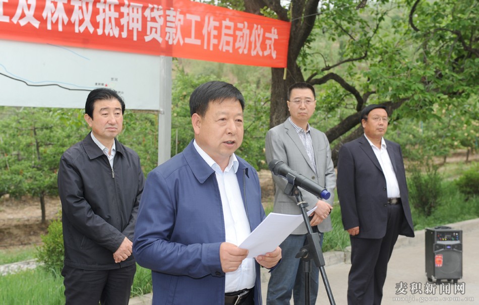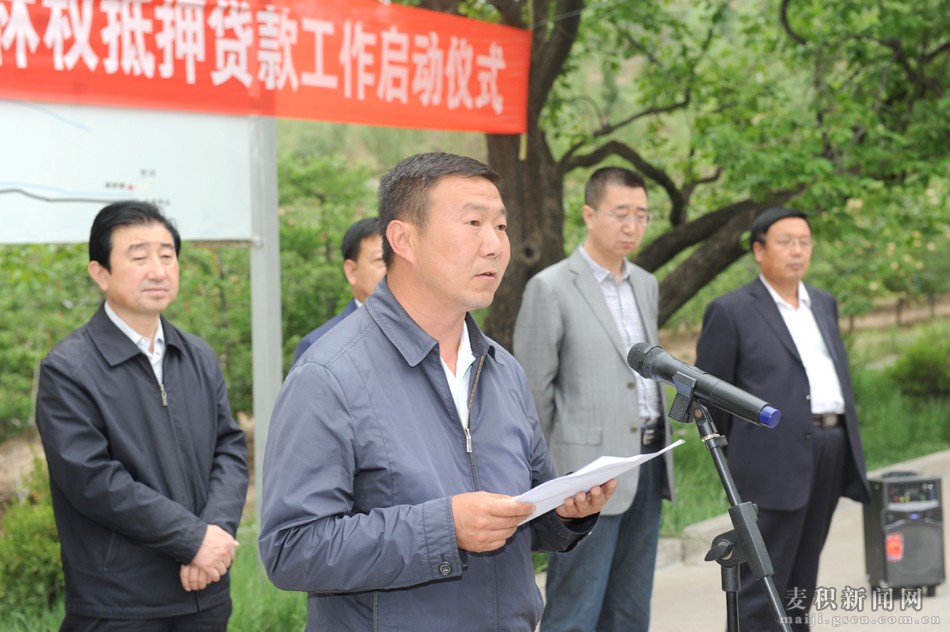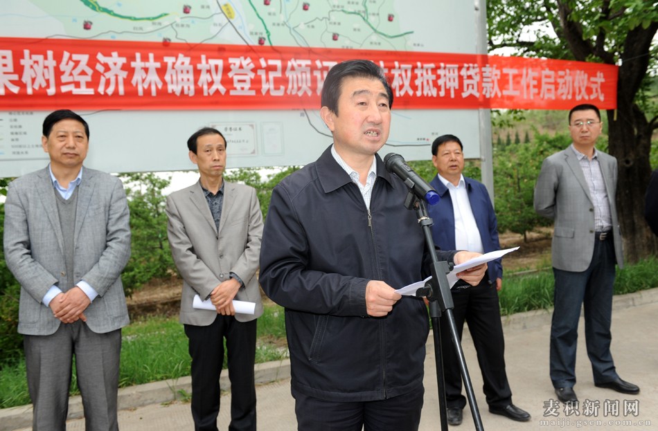 王彥軍代表麥積區(qū)委、區(qū)政府講話,他說,近年來,麥積區(qū)堅持把林果產(chǎn)業(yè)發(fā)展放在農(nóng)業(yè)增效、農(nóng)民增收的重要戰(zhàn)略位置,按照“四產(chǎn)齊抓、果業(yè)當(dāng)家,百果齊抓、花牛當(dāng)家”的發(fā)展思路,以推進土地流轉(zhuǎn)標(biāo)準(zhǔn)化規(guī)模建園為抓手,以實現(xiàn)林果產(chǎn)業(yè)提質(zhì)增效為目標(biāo),創(chuàng)新管理機制,整合項目資金,強化扶持引導(dǎo),壯大基地規(guī)模,全區(qū)林果產(chǎn)業(yè)得到了長足的發(fā)展。目前,全區(qū)經(jīng)濟林總面積達到65.4萬畝,產(chǎn)量達到49.02萬噸,果品總收入達到15.67億元,農(nóng)民人均果品收入達到3917元,果品產(chǎn)業(yè)已成為廣大農(nóng)民群眾脫貧致富的主導(dǎo)產(chǎn)業(yè)之一。但是由于林權(quán)抵押擔(dān)保體系不健全,融資難、融資貴的問題始終沒有得到有效解決,嚴(yán)重挫傷了廣大果品生產(chǎn)經(jīng)營者的積極性。在全區(qū)乃至全市果品產(chǎn)業(yè)提質(zhì)增效的關(guān)鍵時期,市委、市政府及時開展果樹經(jīng)濟林確權(quán)登記頒證及林權(quán)抵押貸款工作,進一步盤活現(xiàn)有果樹經(jīng)濟林業(yè)資源,明晰所有權(quán)、使用權(quán)和收益權(quán),讓果農(nóng)擁有《果樹經(jīng)濟林林權(quán)證》,用林權(quán)抵押向金融機構(gòu)申請貸款,對于創(chuàng)新完善果品產(chǎn)業(yè)投融資機制,有效破解林果產(chǎn)業(yè)發(fā)展融資難問題,全力打贏脫貧攻堅戰(zhàn)具有十分重要的意義。