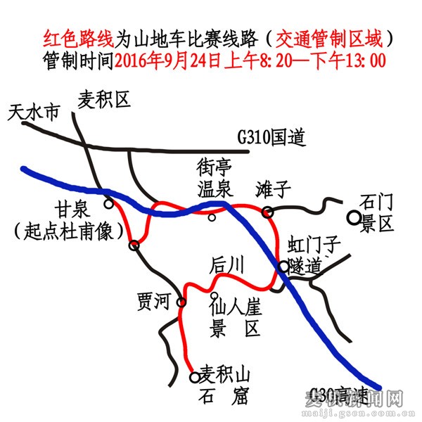 2016年“麥積山杯”全國山地自行車邀請賽將于9月24日(星期六)在麥積山風(fēng)景名勝區(qū)舉行。為保證比賽順利進(jìn)行,比賽當(dāng)天需要對比賽線路進(jìn)行限時交通管制。實行交通管制的路段(即比賽線路)從甘泉鎮(zhèn)杜甫像路口(起點)出發(fā),經(jīng)元店至街子溫泉,沿環(huán)形旅游線到達(dá)灘子,經(jīng)虹門子隧道至后川、仙人崖,途徑賈河到達(dá)麥積山山腳(終點),交通管制時間為2016年9月24日上午8:20—下午13:00。