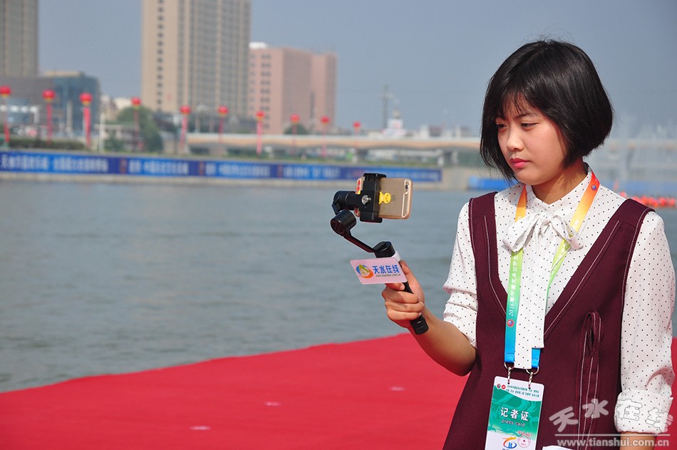 ▲天水在線云記者正在現(xiàn)場直播2016年中國龍舟公開賽(甘肅·天水·麥積站)比賽