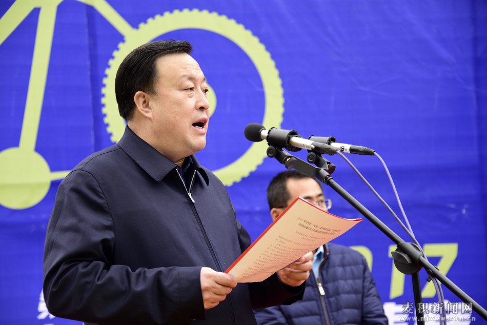 市政府副市長(zhǎng)張建杰講話(huà)。他代表中共天水市委、市人大、市政府、市政協(xié)向本次比賽的開(kāi)賽表示熱烈祝賀,向出席今天發(fā)車(chē)儀式的各位領(lǐng)導(dǎo)、各位來(lái)賓及參賽運(yùn)動(dòng)員、裁判員表示誠(chéng)摯問(wèn)候,向?yàn)楸敬伪荣惤o予大力支持的社會(huì)各界人士表示衷心感謝。張建杰說(shuō),今天在麥積區(qū)舉辦的“麥積山杯”全國(guó)山地自行車(chē)邀請(qǐng)賽,是我市依托國(guó)家5A級(jí)景區(qū)麥積山,精心打造的本土品牌賽事,已經(jīng)舉辦了四屆,具有廣泛的影響力,是全國(guó)體育旅游精品賽事。舉辦好本次比賽,對(duì)于豐富廣大群眾文化體育生活,推動(dòng)天水體育文化旅游融合發(fā)展,提升天水對(duì)外知名度和影響力具有十分重要的意義。