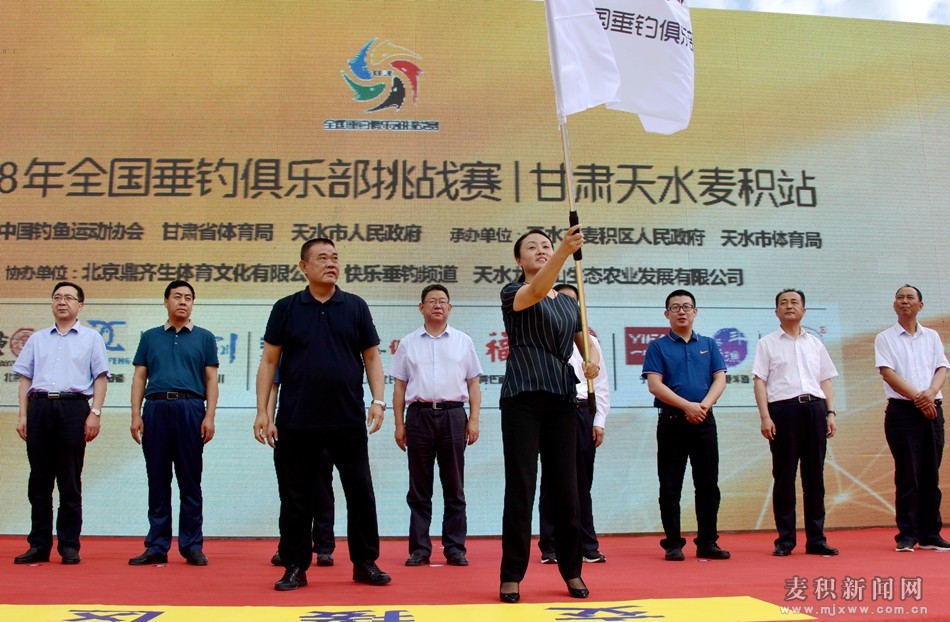 開(kāi)幕式上,蘇寶生為麥積區(qū)授牌“全國(guó)釣魚(yú)基地聯(lián)盟單位”,馬惠英為麥積區(qū)交接了賽旗。