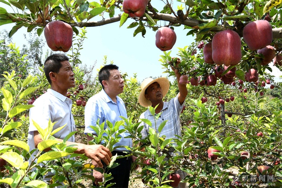 8月26日,麥積區(qū)慕達果品農(nóng)民專業(yè)合作社工作人員正在果品基地查看蘋果長勢,紅滿枝頭的“花!碧O果即將迎來采摘季。