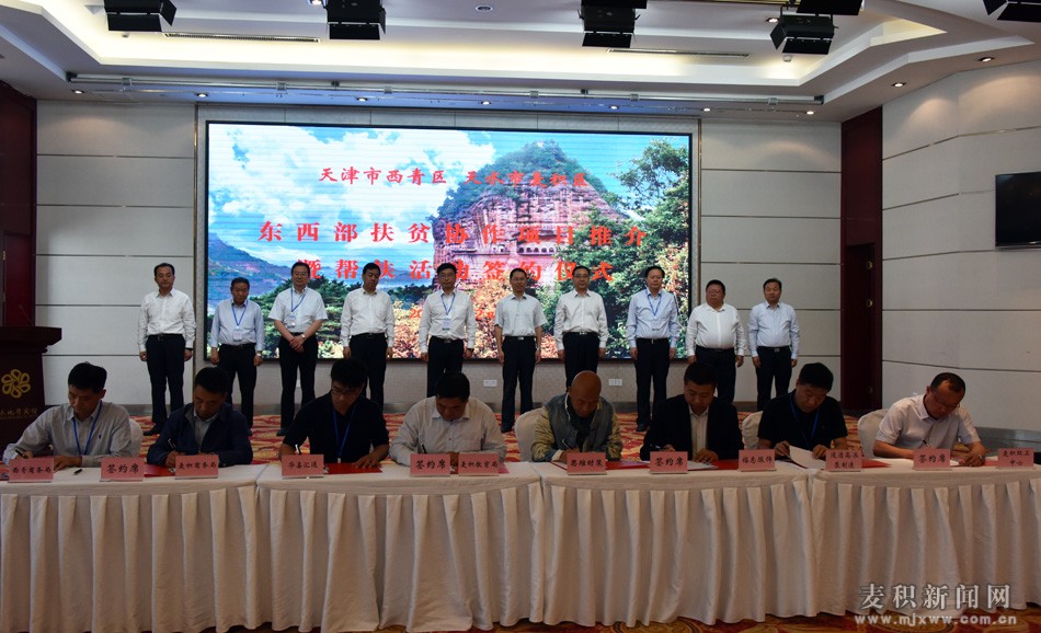 在簽約儀式上,西青區(qū)商務(wù)局和麥積區(qū)商務(wù)局簽訂了《消費(fèi)扶貧合作意向書》;天津華喜匯通公司和麥積區(qū)教育局簽訂了《幫扶捐贈(zèng)協(xié)議》;天津思維方式時(shí)裝有限公司和天水福志服飾有限公司簽訂了《訂單式扶貧車間加工意向協(xié)議》;天津市通潔高壓泵制造有限公司和麥積區(qū)城鄉(xiāng)環(huán)境衛(wèi)生治理服務(wù)中心簽訂了《車輛捐贈(zèng)協(xié)議》;天津華喜匯通公司和甘肅忙鮮供應(yīng)鏈有限公司簽訂了《消費(fèi)扶貧產(chǎn)品采購(gòu)協(xié)議》;天津眾聯(lián)智能科技有限公司和麥積區(qū)教育局簽訂了《資助協(xié)議書》;天津新宇彩板有限公司和麥積區(qū)利橋鎮(zhèn)蔚民村、中灘鎮(zhèn)謝坪村簽訂了《對(duì)口幫扶協(xié)議》;天津鑫寶龍電梯集團(tuán)有限公司和麥積區(qū)元龍鎮(zhèn)和平村簽訂了《對(duì)口幫扶協(xié)議》;清華大學(xué)EMBA天津校友會(huì)和麥積區(qū)教育局簽訂了《捐贈(zèng)協(xié)議書》;天津市通潔高壓泵制造有限公司和麥積區(qū)東臺(tái)種養(yǎng)殖農(nóng)民專業(yè)合作社簽訂了《捐贈(zèng)協(xié)議》。