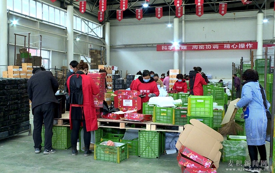 與此同時,在花牛蘋果(集團)有限責任公司庫房,工人們正在打包銷售的蘋果。公司自建成以來已經(jīng)帶動全區(qū)13000余戶農(nóng)戶共同發(fā)展,吸納了參與務工群眾1000多人,帶動農(nóng)戶增收1300萬元,支付農(nóng)民工工資300余萬元,為全區(qū)農(nóng)民脫貧致富奔小康做出了積極貢獻。
