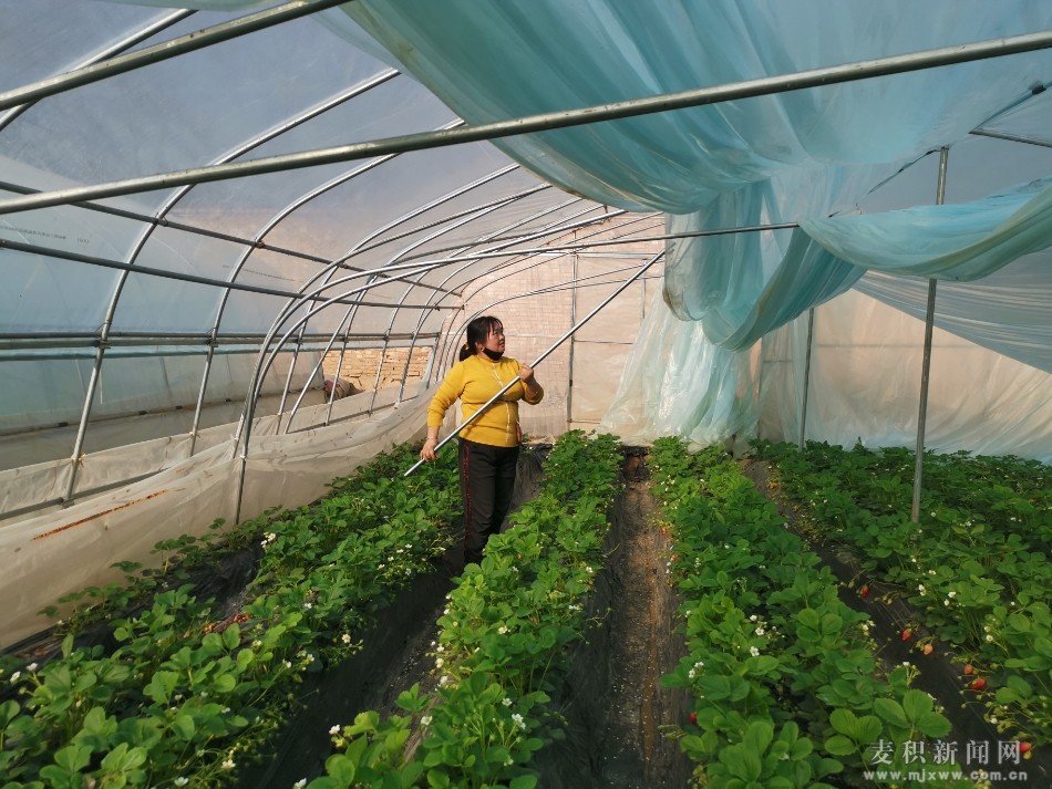 在位于中灘鎮(zhèn)的麥積區(qū)設(shè)施櫻桃示范園里,工人們正在地里勞作。文貴霞是五龍鎮(zhèn)人,為了補(bǔ)貼家用,經(jīng)麥積區(qū)扶貧公司介紹,來到中灘鎮(zhèn)麥積區(qū)設(shè)施櫻桃示范園工作,主要負(fù)責(zé)育好櫻桃苗,種好櫻桃樹,收好櫻桃果,種好時令蔬菜。如今她在這里工作已經(jīng)是第三個年頭了,提起扶貧產(chǎn)業(yè)的好政策,她激動地豎起大拇指!拔以谶@里上班,每月工資能達(dá)到兩千元以上,家里也能兼顧上,挺不錯的。”文貴霞說。