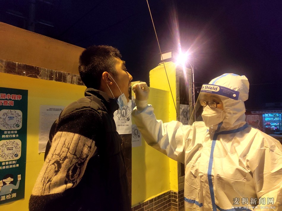 當天晚上,麥積區(qū)道北街道濱河路水廠家屬院、三角地、西閘口家屬樓等小區(qū)在西排洪渠樣本采集點進行核酸檢測采樣。在瑟瑟秋風里,等待檢測的居民都佩戴口罩、保持一米線間隔,一切都井然有序。