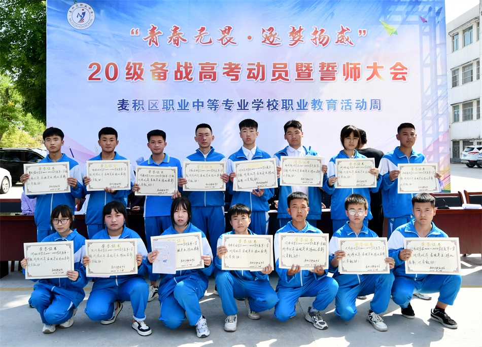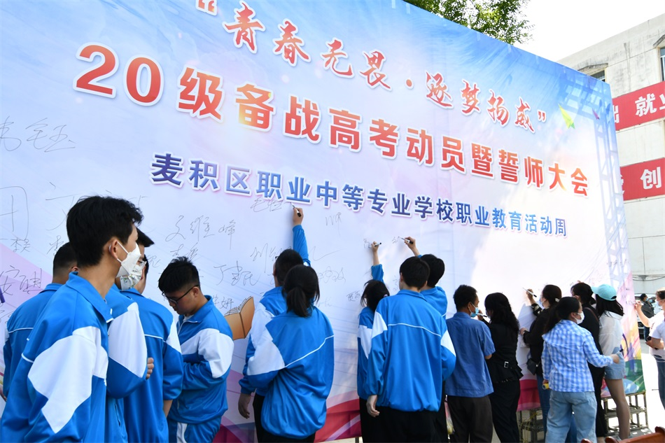 麥積區(qū)融媒體中心訊(通訊員 霍玉霞)5月24日,麥積區(qū)職業(yè)中等專業(yè)學校舉行以“青春無畏、逐夢揚威”為主題的備戰(zhàn)高考沖刺誓師大會,為麥積職專2020級學子們沖刺2023年高考加油助力。