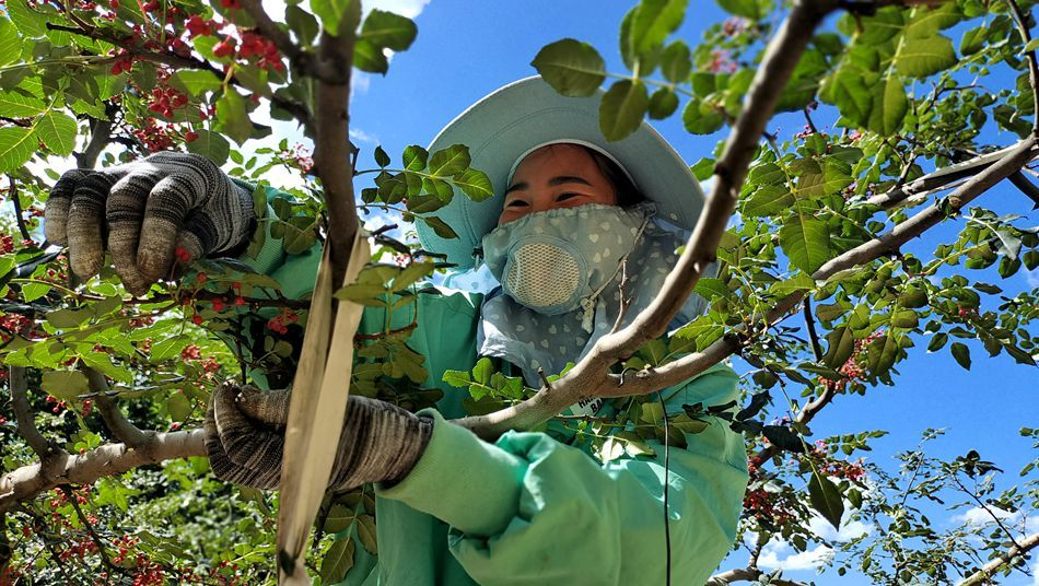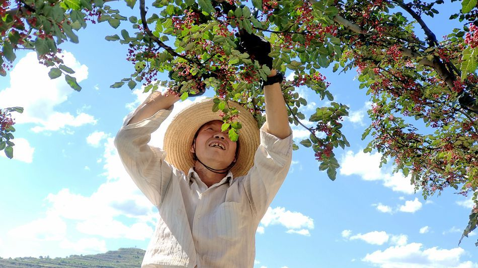 雖然天氣炎熱,花椒地?zé)崂藵L滾,可是椒農(nóng)的臉上洋溢著笑容,這是屬于豐收的喜悅。椒農(nóng)納寬生和他請(qǐng)來(lái)專(zhuān)門(mén)采摘花椒的人們一起在地里忙活著,大家在地里說(shuō)說(shuō)笑笑,可手里的活一點(diǎn)兒沒(méi)停。地里擺放著的鍋碗瓢盆和水壺,這是他們吃飯的家伙。由于花椒簇簇,一樹(shù)繁盛,一名椒農(nóng)手工采摘一天有時(shí)也只能采摘一棵樹(shù),所以從花椒采摘起,為搶抓農(nóng)時(shí),納寬生等人一天的時(shí)間都在地里度過(guò)。
