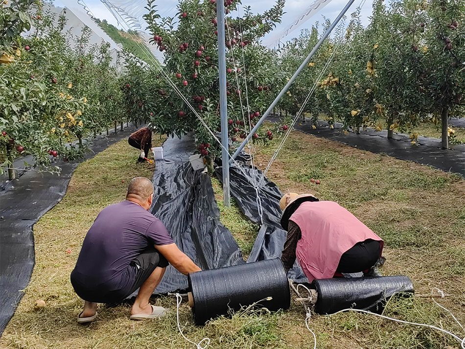 “防雹網(wǎng)對蘋果的生長可是起著重要的作用哩!如果沒有架設(shè)防雹網(wǎng),遇到雷雨等特殊天氣,蘋果就會受傷,成熟后蘋果也會‘傷痕累累’,導(dǎo)致價格‘一落千丈’。如果果樹受損嚴重,還會造成果園很大的損失!币晃还ぷ魅藛T向記者介紹,“我們合作社一直采取精細化管理技術(shù),幾年前就架了防雹網(wǎng),現(xiàn)在馬上就到了蘋果大量采收的時期,對果園部分破損的防雹網(wǎng)進行修補,能夠防止特殊天氣對蘋果的影響,另外也能減少飛鳥進入果園對蘋果的破壞!