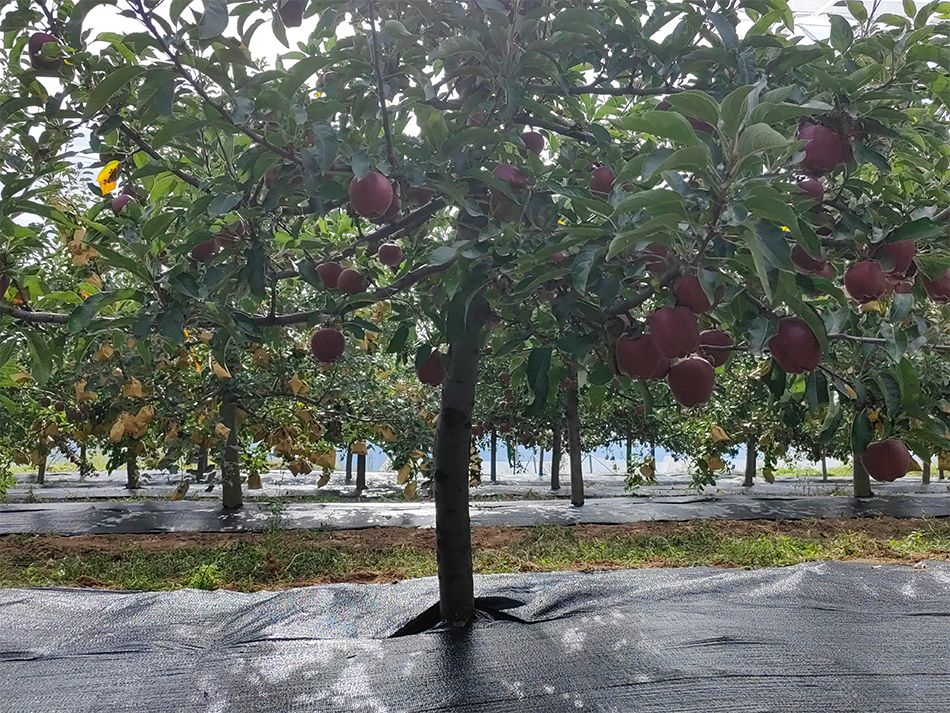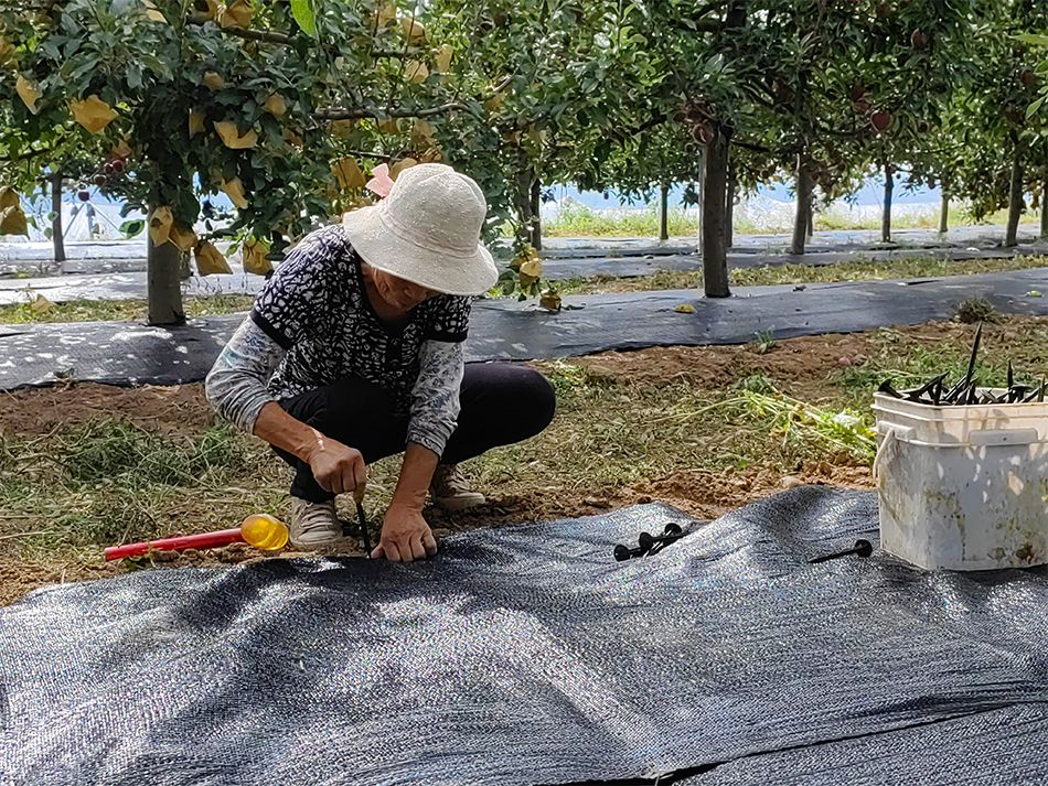 與樹頂白色“紗帳”形成對比的是樹下逐行鋪設(shè)的黑色園藝地布。據(jù)了解,這種黑色的園藝地布也稱“防草布”“地面編織膜”等,主要用于地面防草,可以有效阻止陽光對地面的直接照射,而其本身堅固的結(jié)構(gòu)能阻止雜草穿過地布,從而保證了地布對雜草生長的抑制作用。同時,這層地布還能夠保持土壤濕度,提高土壤養(yǎng)分的利用率,增加果實產(chǎn)量。