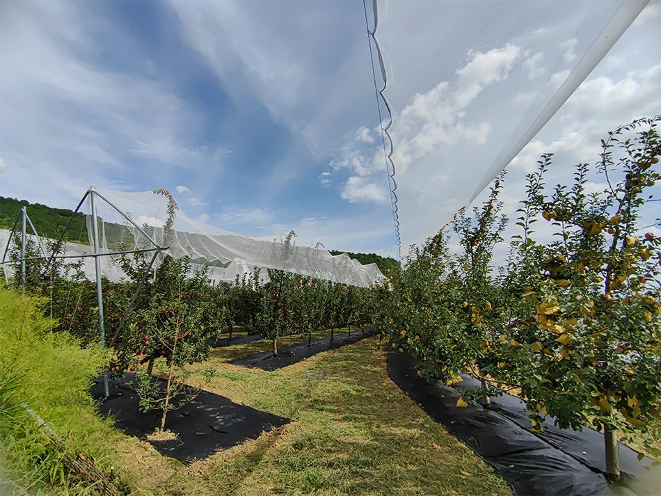 在果園中,蘋果樹頂上那一排排白色的“紗帳”就是工作人員所說的防雹網(wǎng)。采收季臨近,工作人員需要及時在部分破損的區(qū)域搭建支柱、加固網(wǎng)架,修補、拉起屋脊式高標準防雹網(wǎng)。