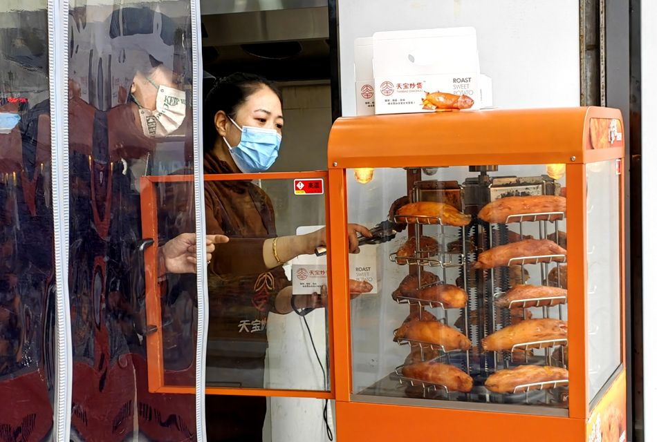 “我們店里的炒貨零食比較齊全,現(xiàn)在天冷了,我們的糖炒栗子、烤蜜薯都很受歡迎!碧鞂毘簇浀陠T王明霞說。