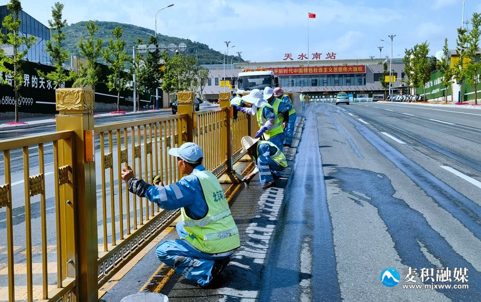 天水京環(huán)集團(tuán)麥積作業(yè)中心羲皇片區(qū)片長邢小云告訴記者,自5月31日起,羲皇片區(qū)組織了80名保潔員,調(diào)配3輛灑水車和2輛高壓沖洗車,對片區(qū)重要路段和點(diǎn)位進(jìn)行全面沖洗!胺謩e對二十里鋪大橋隔離欄和雙黃線、高鐵南站道路中間隔離欄、羲皇大道沿線有軌電車項(xiàng)目工地護(hù)板、圍擋、電箱、護(hù)欄底下瓷磚,天秀橋護(hù)欄、人行道以及高速輔道沿線野草雜物、綠色圍擋等重點(diǎn)路段、重要點(diǎn)位進(jìn)行全面沖洗、全方位整治,盡心盡力為廣大市民及外來游客創(chuàng)造干凈整潔的出行和旅游環(huán)境!