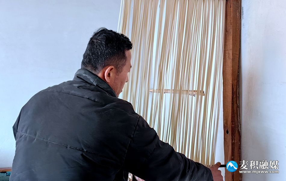 麥積區(qū)融媒體中心訊(記者 任澤瑄 王惠萍)春節(jié)前夕正是麥積區(qū)甘泉鎮(zhèn)廖莊村加工掛面的黃金季,也是家家戶戶制作掛面最忙碌的時候。此時的廖莊村,處處彌漫著濃郁的面香,一排排懸掛著的手工掛面如一道道金黃的綢緞在面架上隨風(fēng)飄動,成為冬日鄉(xiāng)村一道亮麗的風(fēng)景。