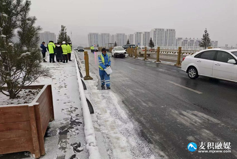 清雪過程中,環(huán)衛(wèi)工人們不懼嚴寒,分工明確、相互協(xié)作,將城區(qū)內(nèi)重要街(路)人行道、過街天橋、公交港灣、醫(yī)院學(xué)校周邊主要道路的積雪和殘冰及時進行了清理。同時,針對便橋、1號橋、2號橋、天秀橋、二十鋪橋及過街天橋和城區(qū)的主干道、人行道等重點區(qū)域,進行了提前布置,隨時開展除雪作業(yè)。在車行道尚未形成明顯積雪時,環(huán)衛(wèi)工人就對易結(jié)冰打滑的坡道、匝道、過境橋拋撒了鹽和融雪劑,有效降低了冰雪凝結(jié)點,防止了路面結(jié)冰。
