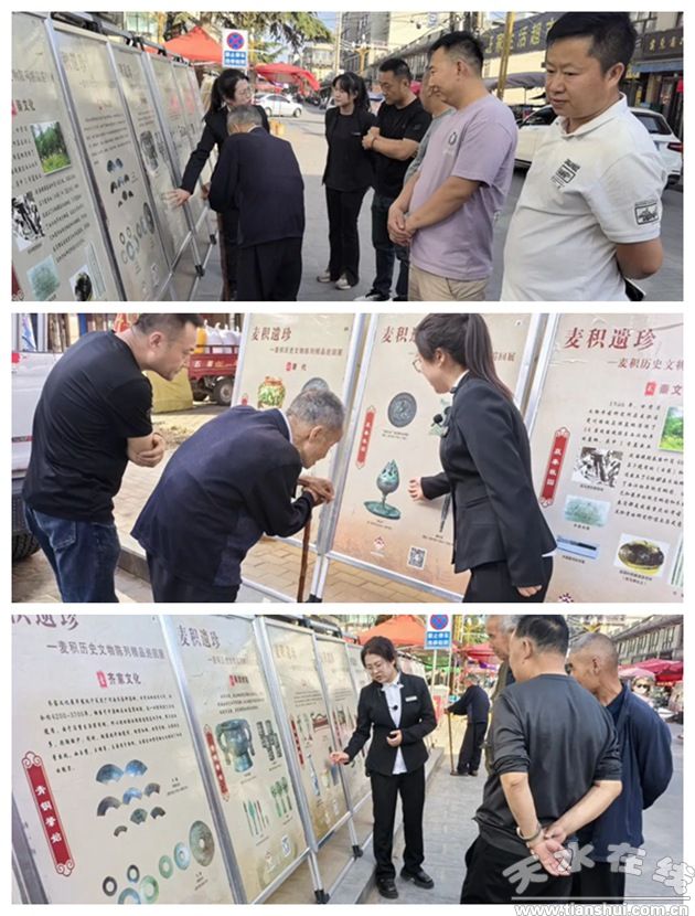 離開校園后,麥積區(qū)博物館的流動展覽走進甘泉鎮(zhèn)玉蘭村。工作人員帶著豐富的展覽資料與宣傳手冊,在熱鬧的村鎮(zhèn)廣場搭建起文化傳播平臺。通過一幅幅精美的展板,向現(xiàn)場群眾展示麥積區(qū)的歷史脈絡與文物瑰寶,同時耐心講解文物保護法律法規(guī)。大家圍聚在展板周圍,饒有興致地聆聽講解,不時詢問展品背后的故事。大家在家門口不僅領(lǐng)略到歷史文化的魅力,更激發(fā)了他們對家鄉(xiāng)文化的認同感與自豪感,進一步拉近了博物館與群眾的距離。