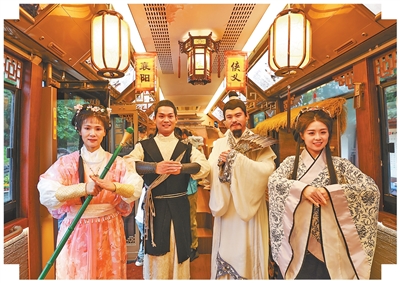 10月5日,湖北襄陽(yáng),“黃蓉”“郭靖”“諸葛亮”“黃月英”(從左向右)在“俠義襄陽(yáng)”旅游公交上與游客互動(dòng)。楊東 攝(人民視覺(jué))