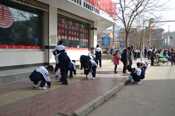 秦安是我家,環(huán)境靠大家。 2月13日星期日。秦安一中學生身著校服、手提白色塑料袋,深入青年東西路、新華街、成紀大道、解放路等主要街道和興國文化廣場撿拾城市的小垃圾,擦洗廣場休閑凳、電信箱、健身器材等公共設(shè)施。