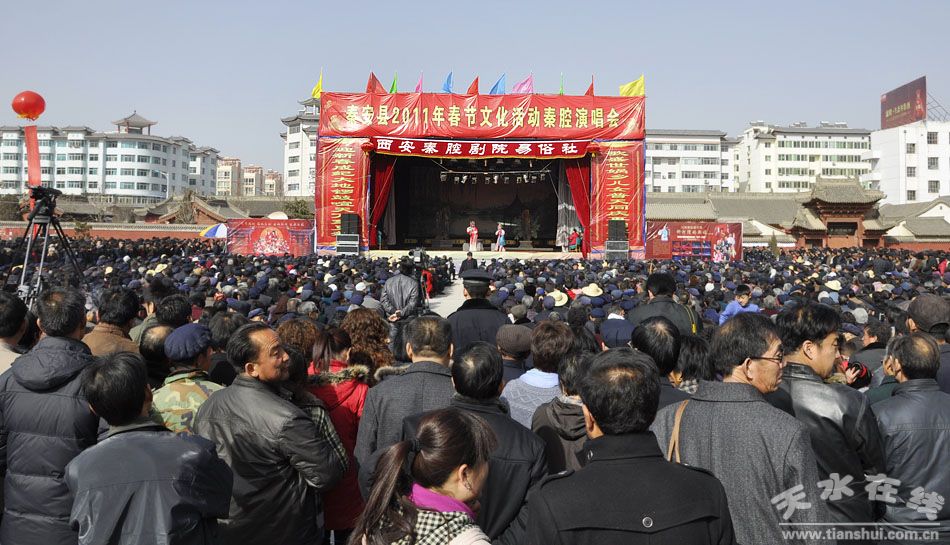 2月12日正月初初十,第一場(chǎng)戲隆重開(kāi)演,出席開(kāi)演儀式的有秦安縣委副書(shū)記程江芬、縣委常委、宣傳部部長(zhǎng)李尚平,縣人大副主任靳蘭生,副縣長(zhǎng)郭雙江,縣政協(xié)副主席馬振寰,西安市秦腔劇院院長(zhǎng)張保衛(wèi),易俗社社長(zhǎng)惠敏麗。