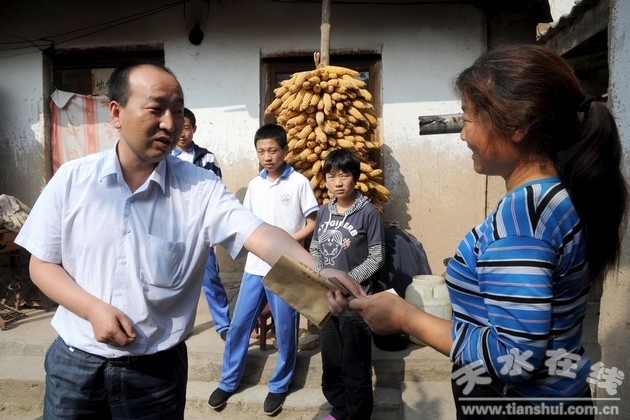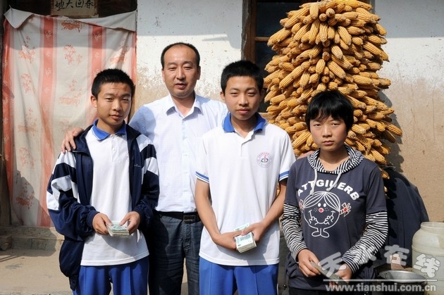 蘭州晨報天水訊(記者王蘭芳)7月11日,本報A12版以《山村“寒窯”里 齊頭飛出三“鳳凰”》為題報道了秦安縣西川鎮(zhèn)王灣村周雄鵬姐弟三人今年以優(yōu)異的成績同時考上大學,后因高考高額學費無著落一家人陷入窘境的消息。刊發(fā)當天消息一經(jīng)《天水在線》網(wǎng)站轉(zhuǎn)載,立即引起甘肅第五建設(shè)集團公司第八工程公司經(jīng)理陶永峰先生愛心關(guān)注。經(jīng)過聯(lián)系,7月17日,在秦安縣委常委、宣傳部長李尚平、蘭州晨報記者、天水在線負責人以及縣教育局、秦安縣一中相關(guān)負責人的陪同下,陶先生一行專程趕到王灣村,以他個人的名義為周雄鵬三姐弟送上了每人各5000元的愛心款。捐款當天,臨時得知周雄鵬媽媽常年有病卻從未去醫(yī)院檢查過身體時,陶總再次捐款1000元,并囑咐孩子媽媽一定去醫(yī)院檢查治療。