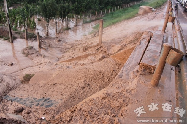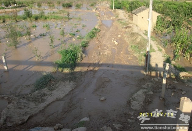 2011年7月15日晚,秦安縣西川鎮(zhèn)折橋村雙溝兒區(qū)域發(fā)生局地強(qiáng)降雨,降雨集中且歷時短,雨水來不及下滲,迅速匯流,并沿溝道快速下泄,引發(fā)山洪災(zāi)害,山洪淹沒了雙溝兒下游兩側(cè)的部分農(nóng)田和果園,大量泥漿漫溢到310國道秦安段(1492KM+400M處),致使該路段嚴(yán)重泥濘。