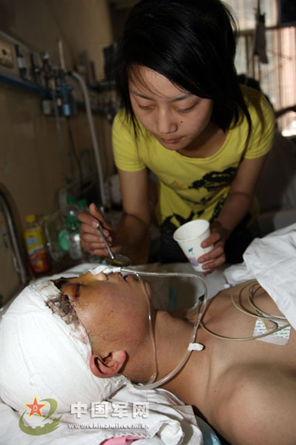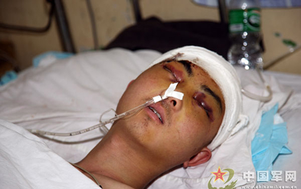 中國軍網(wǎng)報(bào)道圖片:因舍身救人躺在醫(yī)院身負(fù)重傷的蔡曉明