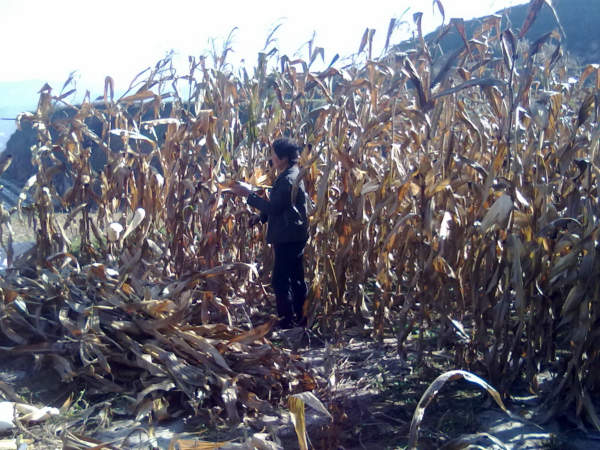 “去年我種的3.5畝小麥,精耕細作辛苦一年,可一畝地才打了400斤過一點。去年麥收后,鄉(xiāng)上調(diào)整種植結(jié)構(gòu),在臥牛坪推廣全膜玉米,說畝產(chǎn)要在1500斤左右。這產(chǎn)量在水川地上我們聽說過,可是到這山上誰也不敢相信,所以大家都抱著嘗試的態(tài)度,響應了政府的號召,種上了全膜玉米,有個別兩三戶不相信,還是種植了小麥,不成想,今年旱情嚴重,普通小麥只有尺把長,一畝地只產(chǎn)300斤左右——玉米就不同了,長勢一直很好,都是雙棒,穗大粒滿,一家人掰了七八天,整整裝了8車,畝產(chǎn)可達1600斤,頂幾畝麥子的收入!彼握谆⒌脑洪T處停著一輛中型藍色時風三輪車,半車未卸載的玉米和車體上迎風晃動著的玉米須,向我們展示著豐收的喜悅。