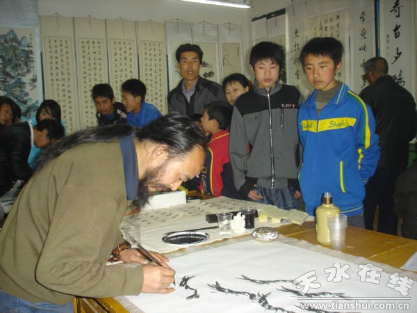 此次展覽共展出了200多名書畫家的300余幅作品和隴城中學師生的400余件作品。在筆會現(xiàn)場,中國書法家協(xié)會會員、平?jīng)鍪袝覅f(xié)會副主席慕鵬軍,中國書法家協(xié)會會員王斌,中國書法家協(xié)會會員馮泊及劉永憲、成熙斌、劉興榮、張鵬、張永宏、朱元平、李向羲等書畫家揮毫潑墨,與當?shù)貢嫄酆谜吆腿罕娀咏涣,將整個活動推向了高潮。