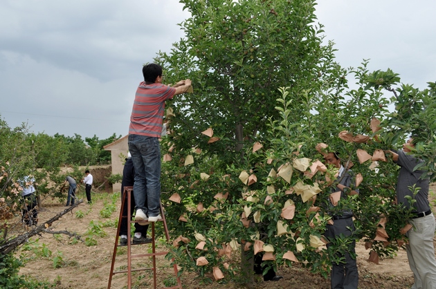 在村民劉萬錄家的果園里,經(jīng)過其妻子李小琴的現(xiàn)場演示,大家開始套袋。雖然干部們對套袋不很熟練,但是他們能吃苦,有耐心,認真細致,半天下來,累計套袋4000多只,受到果農(nóng)們的稱贊。