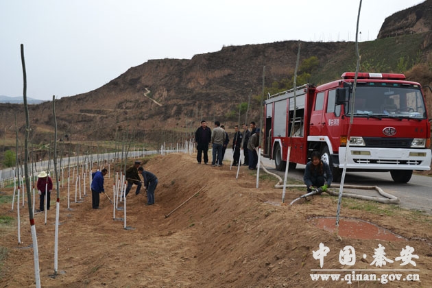 在何楊荒灘荒坡生態(tài)綠化示范點(diǎn),記者見(jiàn)到了頭戴草帽,手拿鐵鍬,正在給樹(shù)苗培土的該鄉(xiāng)副鄉(xiāng)長(zhǎng)姚紅紅,他告訴記者,該示范點(diǎn)是由他來(lái)具體負(fù)責(zé)的,這里的苗木栽植已全面完成,接下來(lái)就是樹(shù)盤整理和澆灌,樹(shù)盤整理統(tǒng)一為長(zhǎng)寬各1米的網(wǎng)狀格,在開(kāi)挖樹(shù)坑之前先根據(jù)地塊實(shí)際情況進(jìn)行統(tǒng)一放線,做到整齊有序。在栽植時(shí),為了減小目測(cè)的誤差,用線繩進(jìn)行樹(shù)干校正,確保樹(shù)苗的整齊劃一!白詮幕顒(dòng)開(kāi)展以來(lái),干部群眾參與綠化的熱情度非常高,對(duì)生態(tài)綠化的意識(shí)也越來(lái)越強(qiáng)。你看,經(jīng)過(guò)相關(guān)領(lǐng)導(dǎo)的協(xié)調(diào)之后,連消防隊(duì)的車輛也參與到了澆樹(shù)的行列中!彼钢愤叺南儡囆χ鴮(duì)記者說(shuō)。