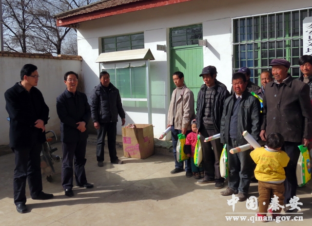 1月24日,新春佳節(jié)即將來臨,為使“雙聯(lián)”村的困難群眾度過一個愉快的節(jié)日,市委宣傳部副部長趙子洲帶領(lǐng)機關(guān)“雙聯(lián)”干部一行5人來到聯(lián)系的秦安縣劉坪鄉(xiāng)陳寨村、赤山村,對困難群眾開展節(jié)前走訪慰問活動,為他們送去黨和政府的關(guān)懷和祝福,為每戶困難家庭帶去了大米等慰問品。