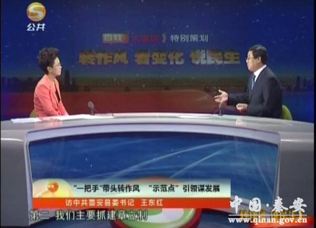 9月13日,中共秦安縣委書記王東紅走進(jìn)甘肅電視臺(tái)公共頻道《百姓大家談》演播室,接受了群眾路線在隴原特別節(jié)目:《轉(zhuǎn)作風(fēng),看變化,說(shuō)民生》——“一把手”帶頭轉(zhuǎn)作風(fēng),“示范點(diǎn)”引領(lǐng)謀發(fā)展專訪。