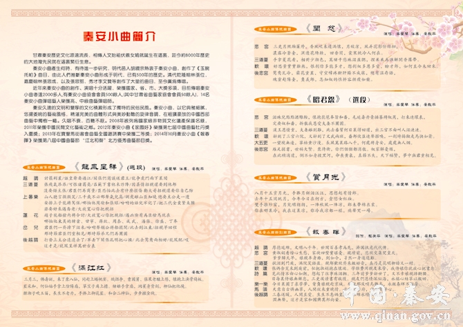 秦安小曲以其歷史悠久,底蘊(yùn)深厚,唱詞典雅細(xì)膩,悠揚(yáng)委婉的藝術(shù)風(fēng)格,精湛完美的曲體形式與美妙動聽的旋律音調(diào),在粗獷豪放的中國西部曲藝中獨(dú)樹一幟,數(shù)百年來一代又一代民間彈唱藝人不斷傳承、創(chuàng)新、發(fā)展,留下了珍貴的文化遺產(chǎn),更是一枝獨(dú)具地方文化特色的藝術(shù)奇葩。它以極大的藝術(shù)感染力吸引著眾多的愛好者爭相學(xué)唱,樂此不疲,全縣現(xiàn)有17個演唱隊,會員500多人,14名秦安小曲彈唱藝人榮獲高、中級曲藝彈唱師,演唱人員達(dá)2000余人。2008年被列為國家級非物質(zhì)文化遺產(chǎn)保護(hù)名錄,2011年榮獲中國民間文化藝術(shù)之鄉(xiāng)。2012年秦安小曲《家園好》榮獲第七屆中國曲藝牡丹獎入圍獎;2013年在寶豐馬街書會曲藝全國邀請賽中榮獲二等獎;2014年10月秦安小曲《報春暉》榮獲第八屆中國曲藝節(jié) “江北和聲”北方優(yōu)秀曲藝節(jié)目獎。