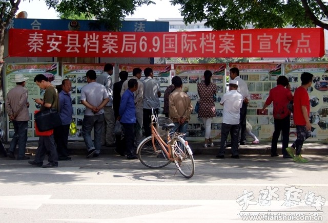 活動當日,秦安縣檔案局積極挖掘館藏檔案資源,舉辦秦安縣“十二五”期間檔案文化資源建設宣傳圖片展,印發(fā)《中華人民共和國檔案法》、《甘肅省檔案條例》、(監(jiān)察部、人社部、國家檔案局《檔案管理違紀違法行為處分規(guī)定》)5000余份,發(fā)放各種檔案宣傳圖冊200余份,并向社會和個人發(fā)出征集重點歷史檔案、地方特色檔案函500余份;顒又,縣檔案局工作人員為廣大市民宣傳講解有關檔案的法律法規(guī)以及檔案的征集、查閱利用等知識,并現場展示近年來全縣檔案編研的成果。