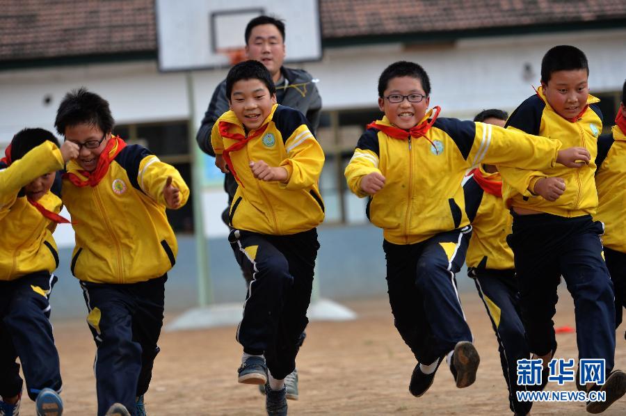 甘肅省天水市秦安縣隴城鎮(zhèn)南七小學(xué)校長陳繼明在給學(xué)生上體育課(9月18日攝)。新華社記者 陳斌