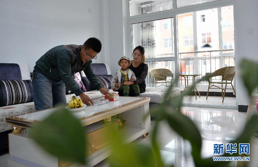 “走教”教師張芳鵬(左一)一家剛剛搬進(jìn)由隴城鎮(zhèn)教育園區(qū)免費(fèi)提供的公寓房(9月18日攝)。新華社記者 陳斌