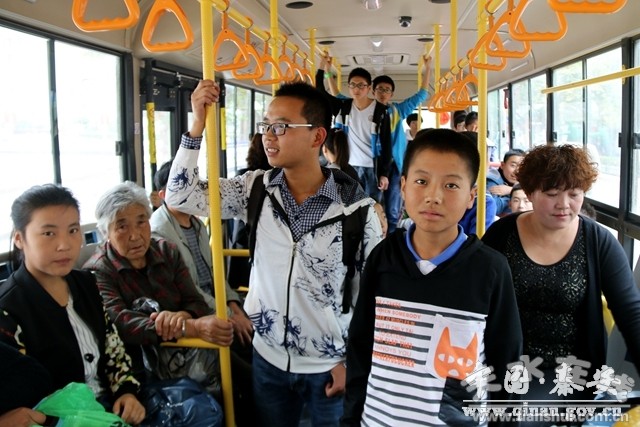 9月27日中午12時許,記者乘上縣職校開往重邦尚城的3路公交車。車上多是放學后回家的學生。行至廣場站,同時上來兩位老人,坐在前排的幾個學生沒等老人家到跟前便離開座位起立并幾乎同時說:“您坐這兒!”,老人家在道謝中入座。車行至下一站,車上打卡器傳來“滴、滴、滴”三聲響,在前排坐著的另外幾位年輕人見到有老人上車,再次爭相讓座。