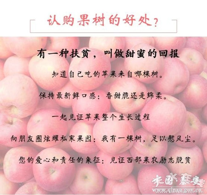 該活動(dòng)是秦安縣電商探索解決農(nóng)民賣果難的創(chuàng)新,通過(guò)互聯(lián)網(wǎng)平臺(tái)在果樹開花時(shí)節(jié)就開始銷售當(dāng)年的蘋果。果樹認(rèn)購(gòu)活動(dòng)為果農(nóng)帶來(lái)三大好處:一是延長(zhǎng)了蘋果銷售時(shí)間,以前蘋果需要經(jīng)過(guò)采摘、儲(chǔ)藏、轉(zhuǎn)運(yùn)才進(jìn)行銷售,不僅增加成本,而且因銷售時(shí)間過(guò)長(zhǎng)造成果品受損,果樹認(rèn)購(gòu)活動(dòng)全年可以進(jìn)行;二是實(shí)現(xiàn)供需平衡,避免農(nóng)產(chǎn)品生產(chǎn)盲目性,果樹被提前認(rèn)購(gòu)后,果農(nóng)可以根據(jù)承諾的產(chǎn)量和品質(zhì)安心打理果樹;三是提前鎖定收益,打破豐產(chǎn)不豐收的怪圈,林果收益提前回籠。此外,廣大認(rèn)購(gòu)果樹的客戶有更好的獲得感和參與感,對(duì)自己所吃的蘋果來(lái)源和生產(chǎn)方式更放心,用自己的行動(dòng)直接參與秦安精準(zhǔn)扶貧行動(dòng)。