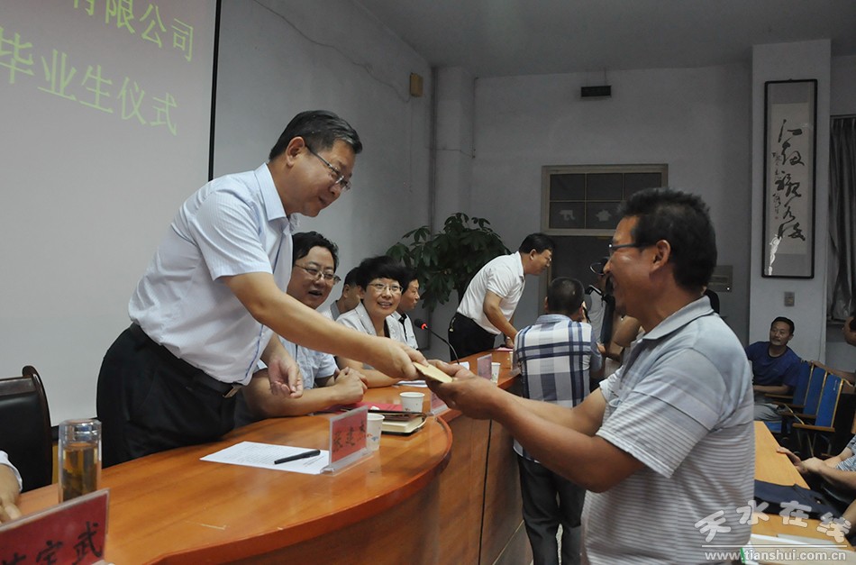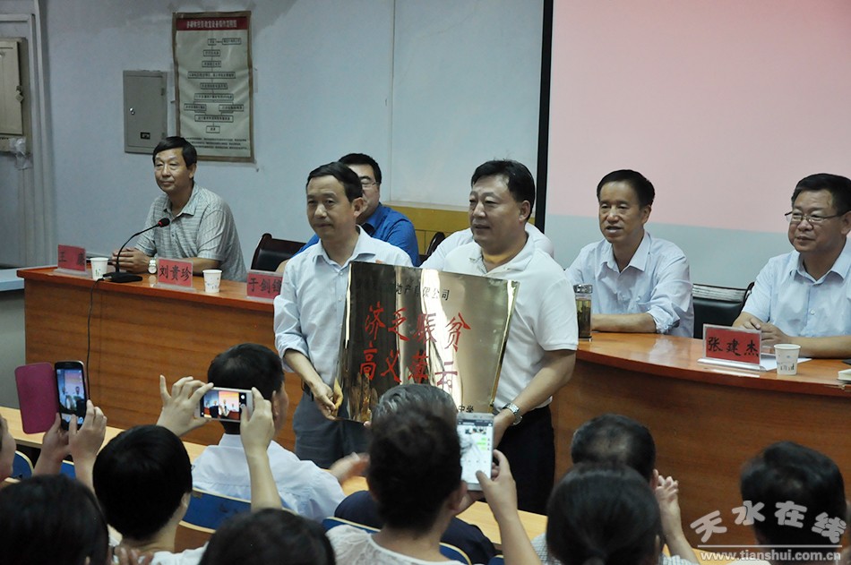 秦安一中校長劉貴珍代表學校向天麟公司贈送銅牌
