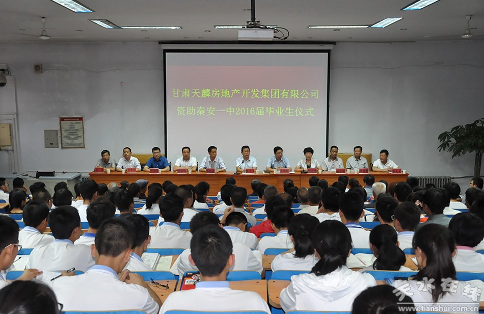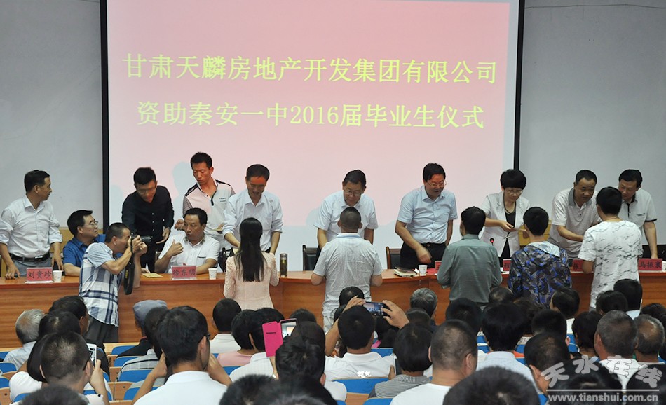 9月2日,甘肅天麟房地產(chǎn)開發(fā)集團有限公司資助秦安一中2016屆畢業(yè)生儀式在秦安縣一中舉行。市政府副市長張建杰出席儀式并講話。市教育局局長蘇定武,秦安縣委書記王東紅,秦安縣委副書記、縣長程江芬及四大組織分管領導,天麟集團董事長候天才,教師學生代表,受資助的學生及家長參加了儀式。