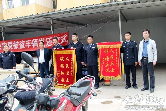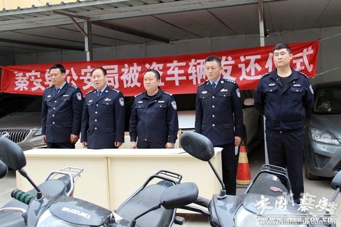4月24日下午,秦安縣公安局在局機(jī)關(guān)院內(nèi)舉行了“1·20”系列摩托車盜竊案涉案車輛返還儀式。對(duì)破案后追回的14輛被盜竊摩托車,及時(shí)向失主予以發(fā)還。