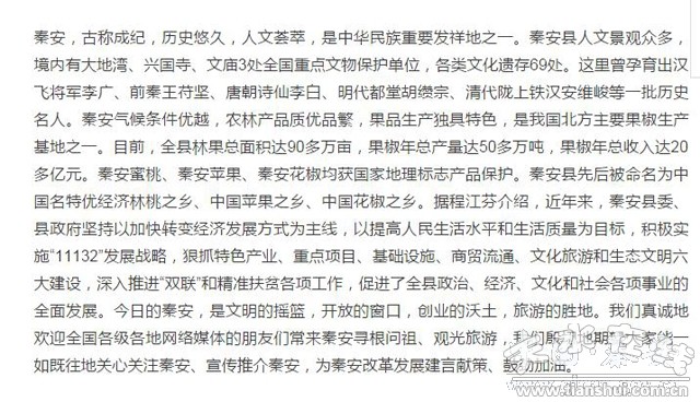 秦安,古稱成紀,歷史悠久,人文薈萃,是中華民族重要發(fā)祥地之一。秦安縣人文景觀眾多,境內有大地灣、興國寺、文廟3處全國重點文物保護單位,各類文化遺存69處。這里曾孕育出漢飛將軍李廣、前秦王苻堅、唐朝詩仙李白、明代都堂胡纘宗、清代隴上鐵漢安維峻等一批歷史名人。秦安氣候條件優(yōu)越,農林產品質優(yōu)品繁,果品生產獨具特色,是我國北方主要果椒生產基地之一。目前,全縣林果總面積達90多萬畝,果椒年總產量達50多萬噸,果椒年總收入達20多億元。秦安蜜桃、秦安蘋果、秦安花椒均獲國家地理標志產品保護。秦安縣先后被命名為中國名特優(yōu)經濟林桃之鄉(xiāng)、中國蘋果之鄉(xiāng)、中國花椒之鄉(xiāng)。