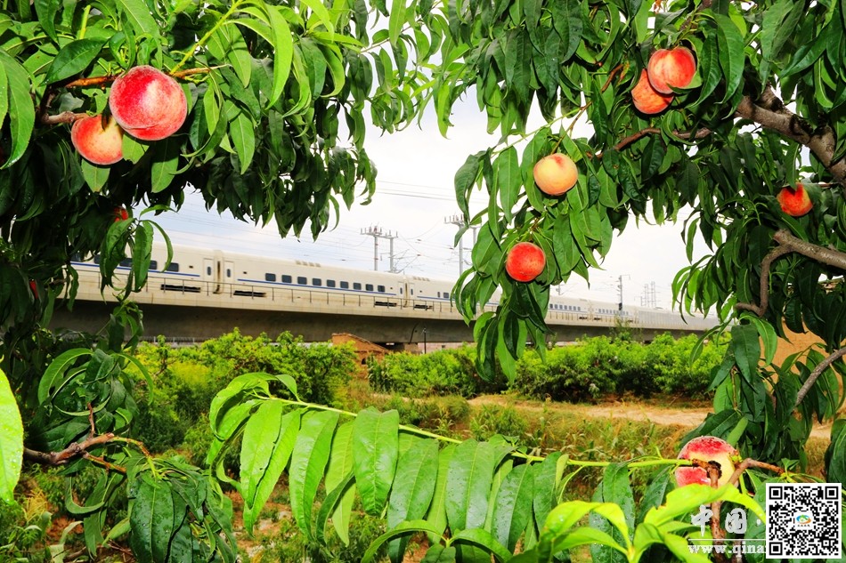 今年4月,正值秦安桃花漸次盛開(kāi)時(shí)節(jié),也是寶蘭高鐵聯(lián)調(diào)聯(lián)試階段。記者曾在西川鎮(zhèn)宋場(chǎng)村拍攝了一組寶蘭高鐵馳騁桃花海的照片,美麗田園畫(huà)卷漫展。時(shí)隔3個(gè)多月時(shí)間,7月26日,記者再次來(lái)到了這片果園,一陣沁人心脾的桃香撲鼻而來(lái),只見(jiàn)園中濃密的枝葉間,一個(gè)個(gè)白里透紅的桃子掛滿(mǎn)枝頭,果農(nóng)們?cè)谔覉@中,或采摘、或運(yùn)送、或分檢裝箱、或查看桃子成熟情況,臉上寫(xiě)滿(mǎn)豐收的喜悅。在筆直的寶蘭高鐵線(xiàn)上,和諧號(hào)“子彈頭”列車(chē)頻繁的來(lái)回穿梭在廣闊的果園中。從春花到夏果,寶蘭高鐵因果園的襯托而神采奕奕,果園因?qū)毺m高鐵的馳騁穿越而生機(jī)無(wú)限。