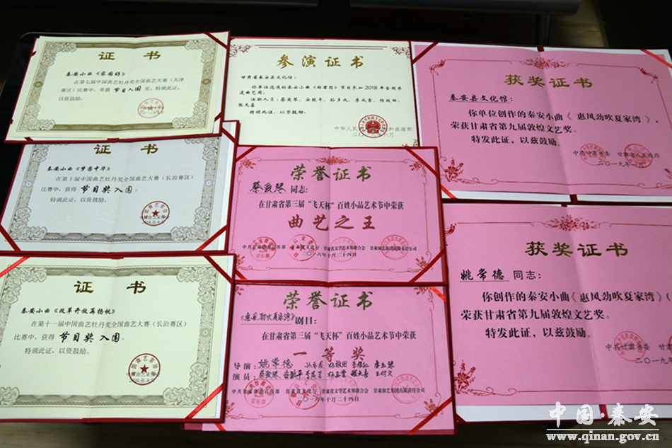 近年來(lái),秦安小曲緊扣時(shí)代主旋律,先后圍繞脫貧攻堅(jiān)、經(jīng)濟(jì)社會(huì)發(fā)展等題材創(chuàng)作出了一系列現(xiàn)代作品。演唱、參賽十分活躍,曾榮獲國(guó)家、省、市級(jí)多個(gè)獎(jiǎng)項(xiàng)。其中,《家園好》2012年5月獲第七屆中國(guó)曲藝牡丹獎(jiǎng)節(jié)目入圍獎(jiǎng);《報(bào)春暉》獲第八屆中國(guó)曲藝節(jié)優(yōu)秀節(jié)目獎(jiǎng)、甘肅省第八屆敦煌文藝獎(jiǎng)三等獎(jiǎng);《夢(mèng)圓中華》2018年獲第九屆中國(guó)曲藝節(jié)優(yōu)秀節(jié)目獎(jiǎng)、甘肅省第三屆曲藝牡丹獎(jiǎng)節(jié)目獎(jiǎng);《改革開(kāi)放再揚(yáng)帆》獲甘肅省“群星藝術(shù)節(jié)”曲藝類一等獎(jiǎng)、第十一屆中國(guó)曲藝牡丹獎(jiǎng)全國(guó)曲藝大賽節(jié)目入圍獎(jiǎng)。