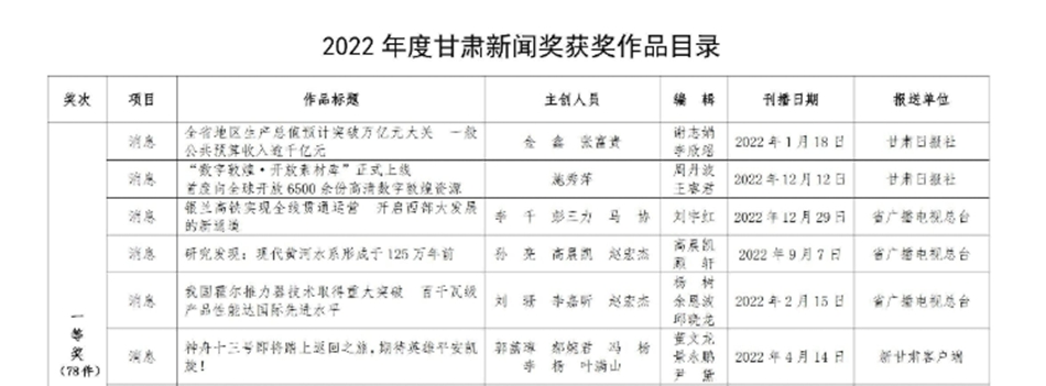據(jù)了解,每年評(píng)選一次的甘肅新聞獎(jiǎng)是全省新聞界綜合性年度優(yōu)秀新聞作品的最高獎(jiǎng)。經(jīng)過(guò)嚴(yán)格評(píng)審,2022年度共評(píng)出甘肅新聞獎(jiǎng)獲獎(jiǎng)作品385件,其中一等獎(jiǎng)78件,二等獎(jiǎng)117件、三等獎(jiǎng)190件。