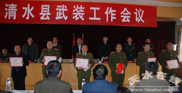 (清水縣委對外宣傳辦公室 朱建峰 楊兆康)4月1日,清水縣召開全縣武裝工作會議,總結(jié)去年全縣的武裝工作,安排部署今年的工作,清水縣委書記、縣人武部黨委第一書記王振宇,縣委副書記、縣長劉天波,縣委常委、副縣長劉中秋,縣人武部政委樂傳平,縣委常委、永清鎮(zhèn)黨委書記夏草、縣人武部部長馬川信出席會議,各鄉(xiāng)鎮(zhèn)黨委書記、武裝部部長(干事)、駐清及縣直有關(guān)編兵單位主要領(lǐng)導(dǎo)參加了會議。