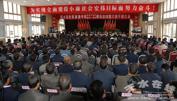 (清水縣委對外宣傳辦公室朱建峰 楊兆康 張建新)9月25日下午,清水縣在軒轅賓館北一、二樓會議室召開縣黨政代表團(tuán)赴晉、冀、京、魯四省市考察農(nóng)業(yè)產(chǎn)業(yè)化、城鄉(xiāng)一體化建設(shè)總結(jié)暨三級干部大會,總結(jié)考察情況,尋找發(fā)展差距,進(jìn)一步解放思想、改革創(chuàng)新,振奮精神、堅定信心,深化認(rèn)識、完善思路,大干實干、跨越發(fā)展,努力開創(chuàng)全縣農(nóng)業(yè)農(nóng)村工作和經(jīng)濟(jì)社會跨越式科學(xué)發(fā)展的新局面。